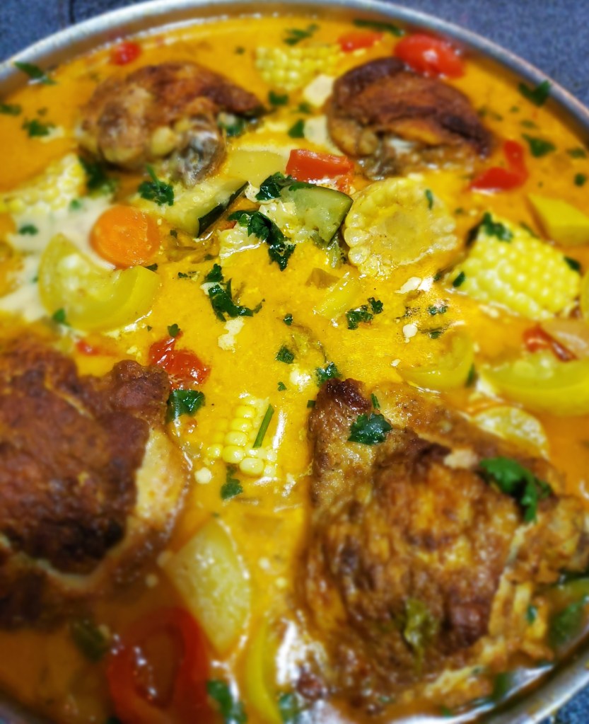 - Remove lid, add coconut milk, stir and cook on medium low into heated through. Serve by itself or over rice. Garnish with cilantro and enjoy.