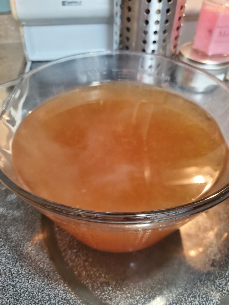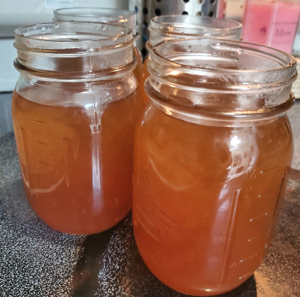 Release the rest of the pressure, allow to cool and then pour through a strainer into 8 cup glass measuring cup. Allow to cool some more and then stir and pour into Mason jars of your choosing. I like the 16oz jars. Let come to room temp and refrigerate until ready to use. I would say stays good for one to two weeks.