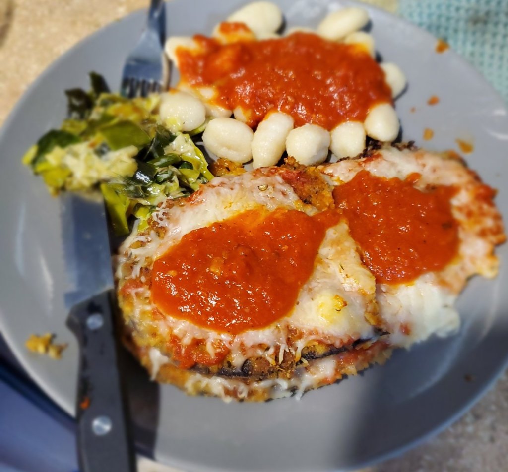 For tonight’s eggplants parmesan I made gnocchi, extra sauce, and creamy leeks. In the past we have just done a salad and a pasta of our choice. I will say that the creamy leeks add a nice balance to the eggplant parmesan and gnocchi. In some dishes I find the creamy leeks too rich but not with this dish tonight.