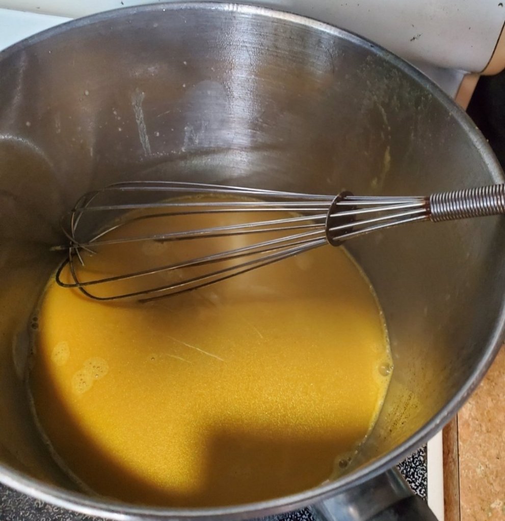- Add all ingredients to pot and bring to slow boil. Whisking to make sure all ingredients blend.